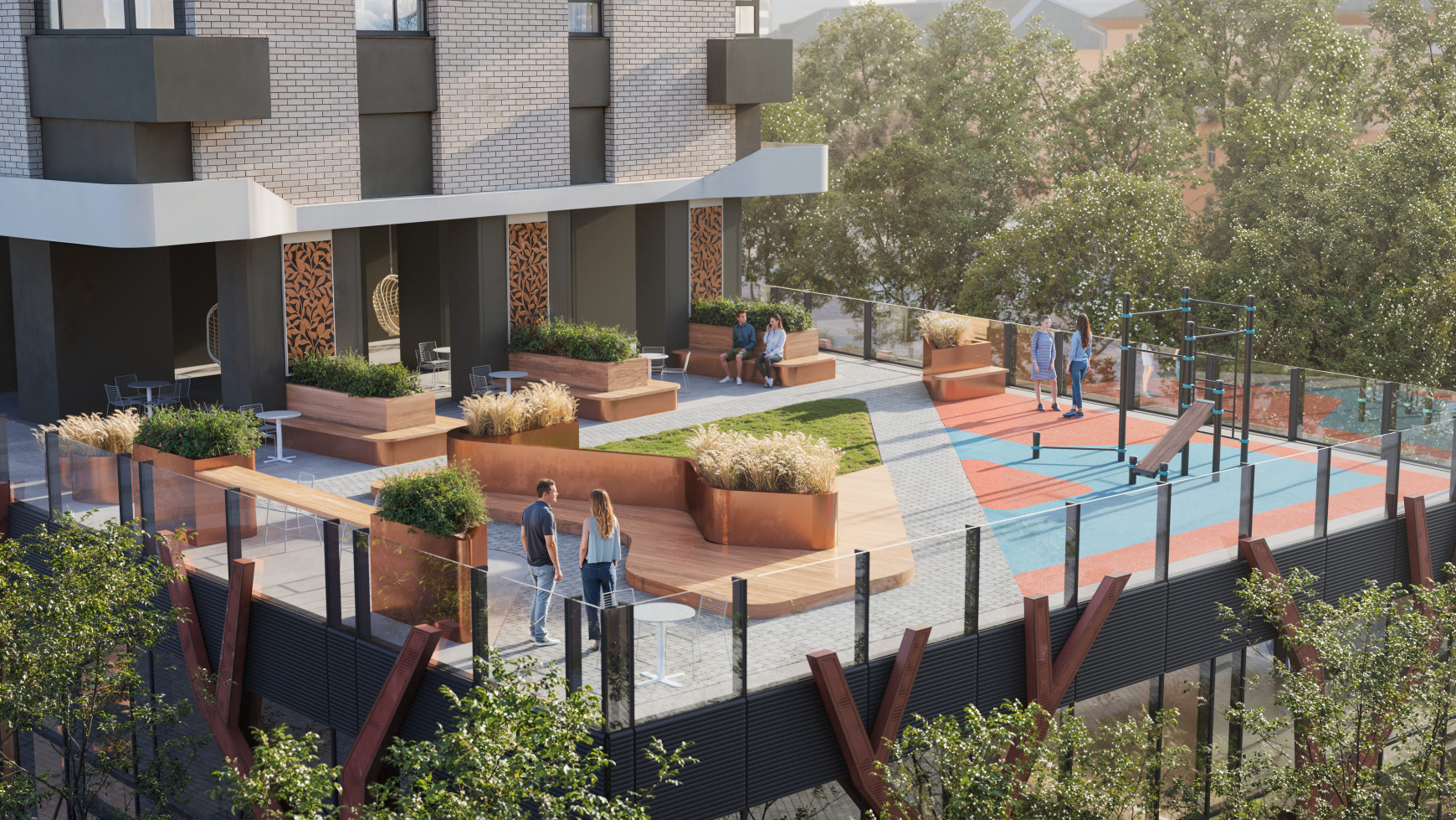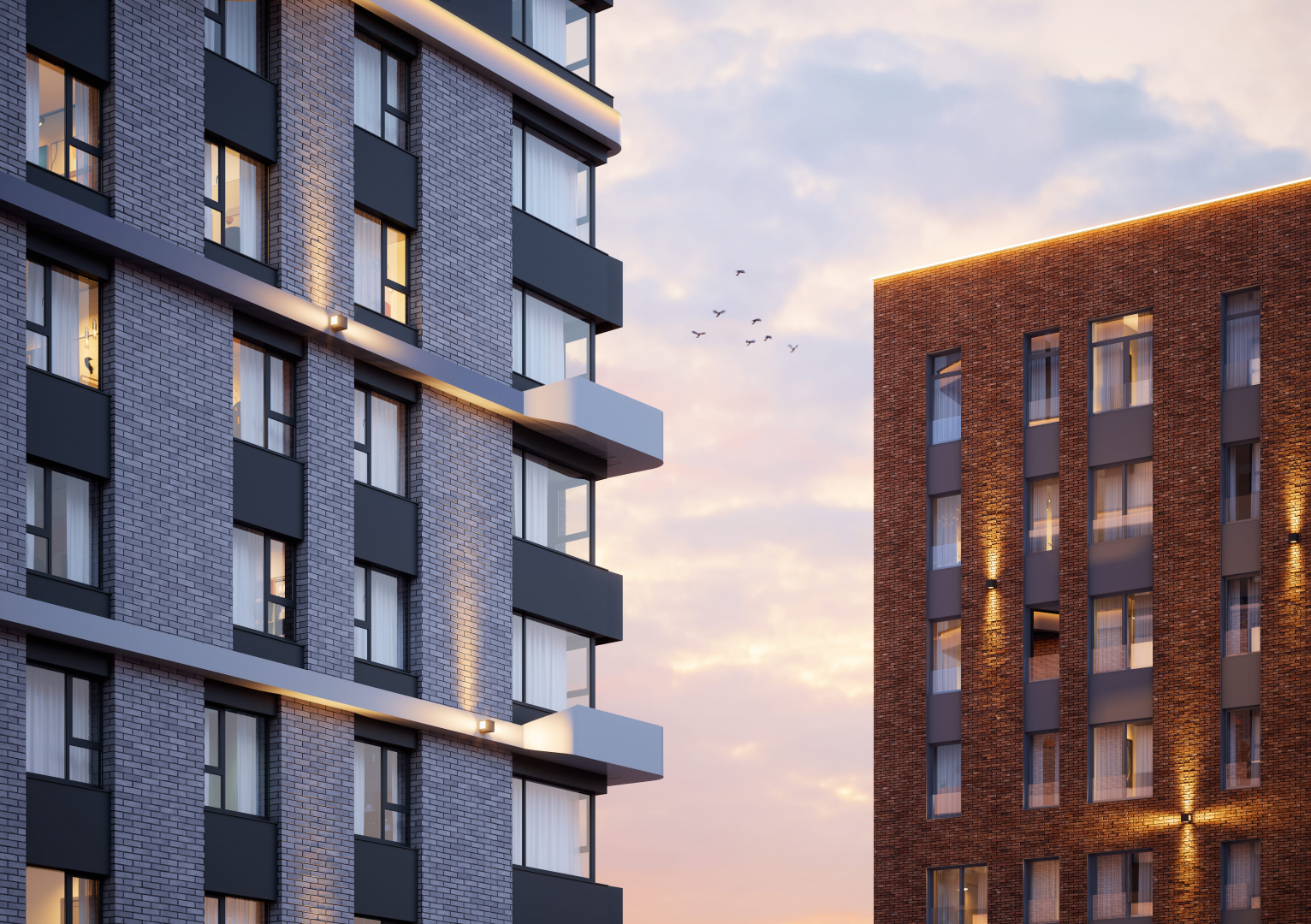 В экстерьере будут использованы декоративная плитка под клинкерный кирпич, композитные панели и фасадная штукатурка. Сложная геометрия фасада подчеркивает архитектуру вне времени: изогнутые линии в сочетании с технологией комбинирования отделки призваны сделать дом архитектурной доминантой всего квартала.