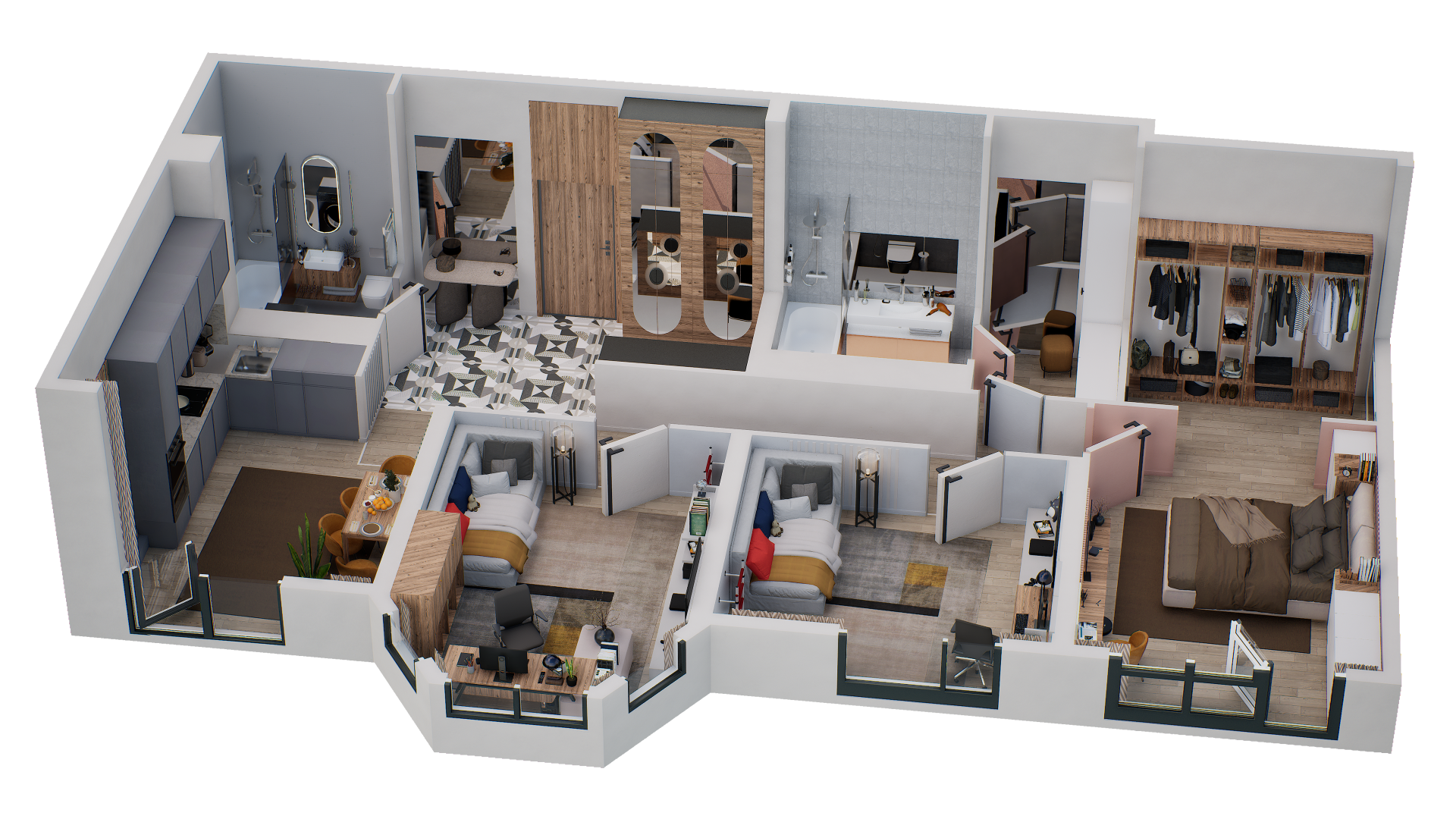В доме 207 квартир и 50 типов планировок от студий 26 кв.м. до 4-комнатных квартир 150 кв.м. Представлены разнообразные планировочные решения: двухуровневые квартиры, планировки с террасами на последних этажах, мастер-спальнями и просторными гостиными.