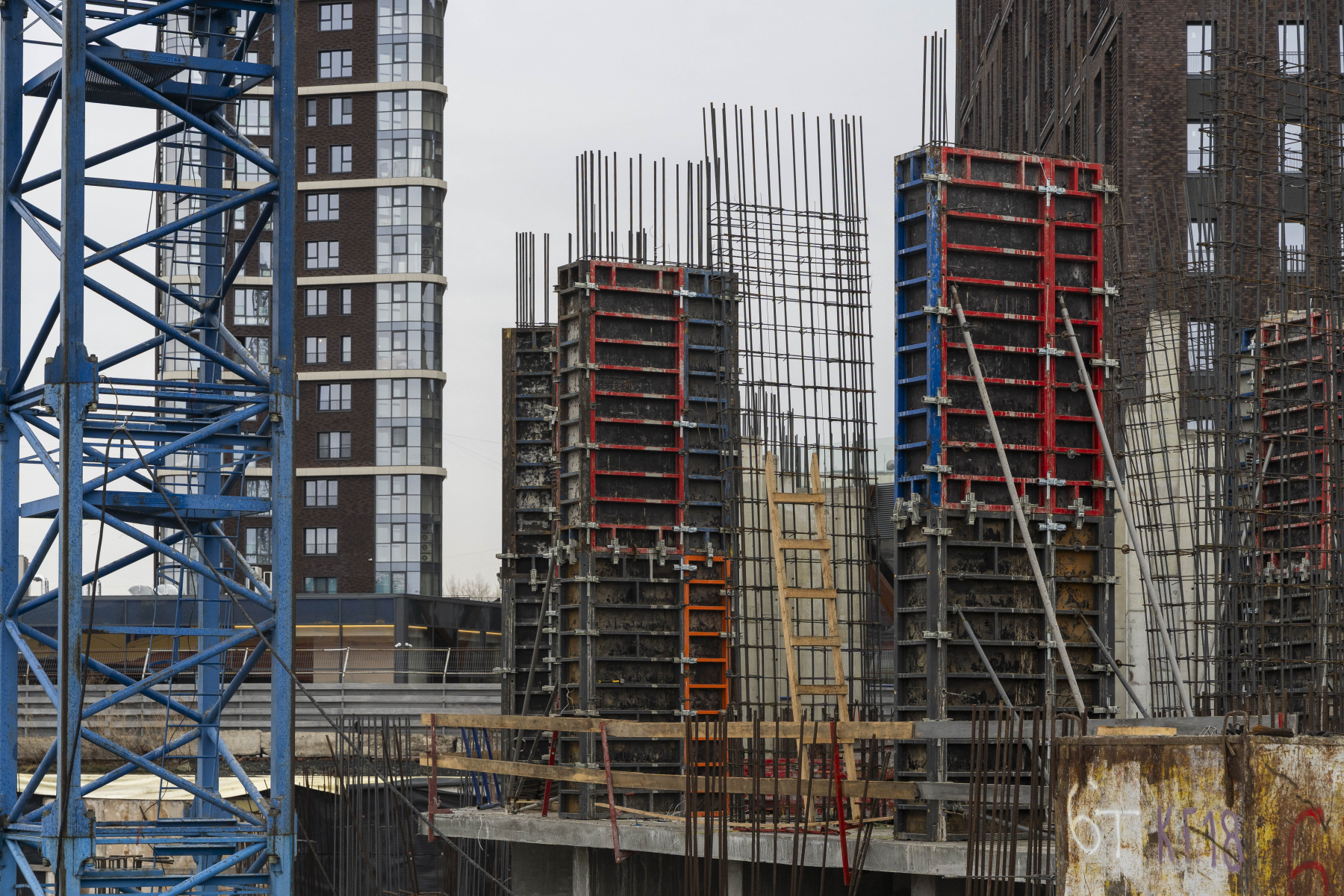 10 фотоПо готовности на май: во втором доме ведутся работы по утеплению фасада и монтажу подсистемы вентилируемого навесного фасада, в третьем доме приступили к возведению монолитных конструкций здания 9-го этажа.