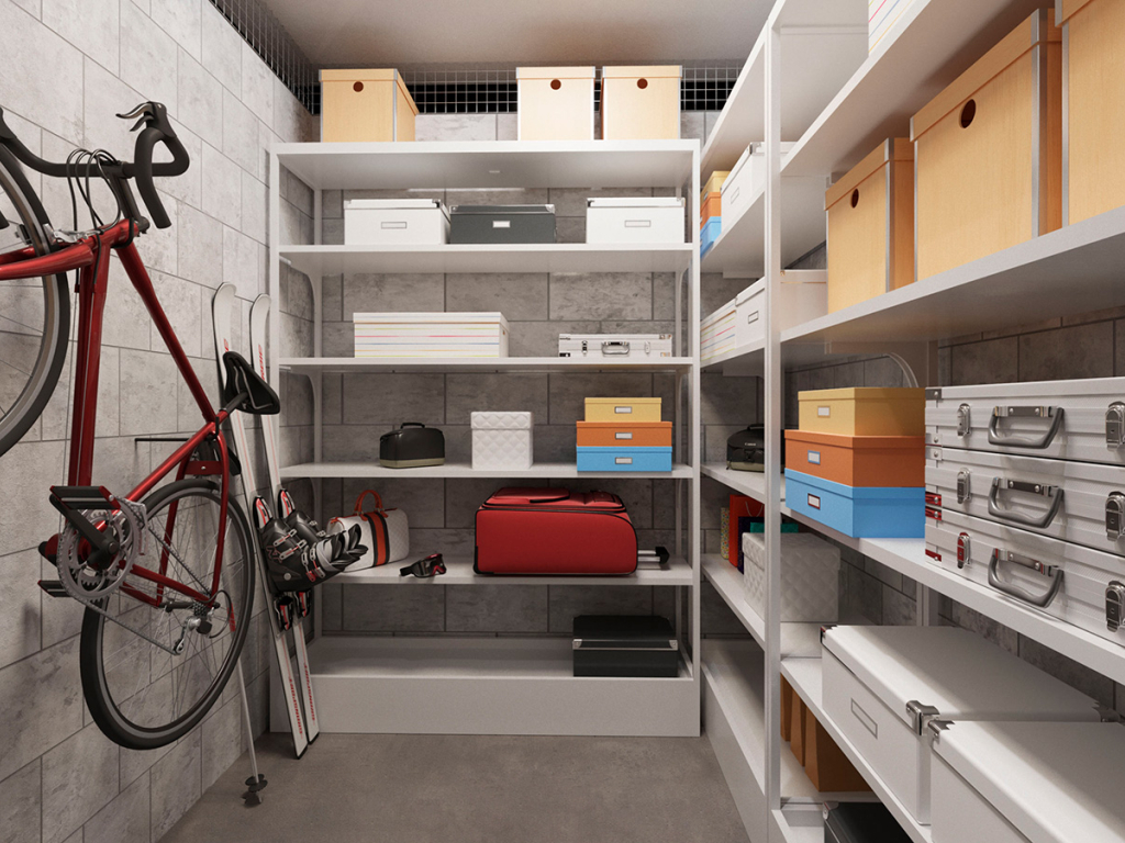 Удобно для хранения строительных материалов, сезонного инвентаря и даже домашних заготовок. Благодаря потолкам 2,5 метров можно сделать стеллаж во всю стену и использовать площадь по максимуму